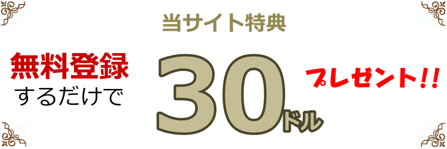 ジパングカジノでは新規アカウント登録で30ドルの入金不要ボーナスがもらえます。しかもボーナス出金条件はたったの10倍です!